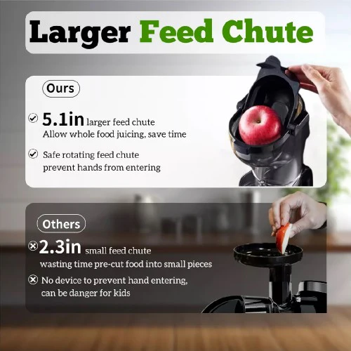 Designed with a wide 5.1-inch (13cm) feed chute, it can easily accommodate whole fruits and vegetables—cutting down on prep time. Features a secure rotary safety lock and a dedicated celery slot for added efficiency and protection during use.