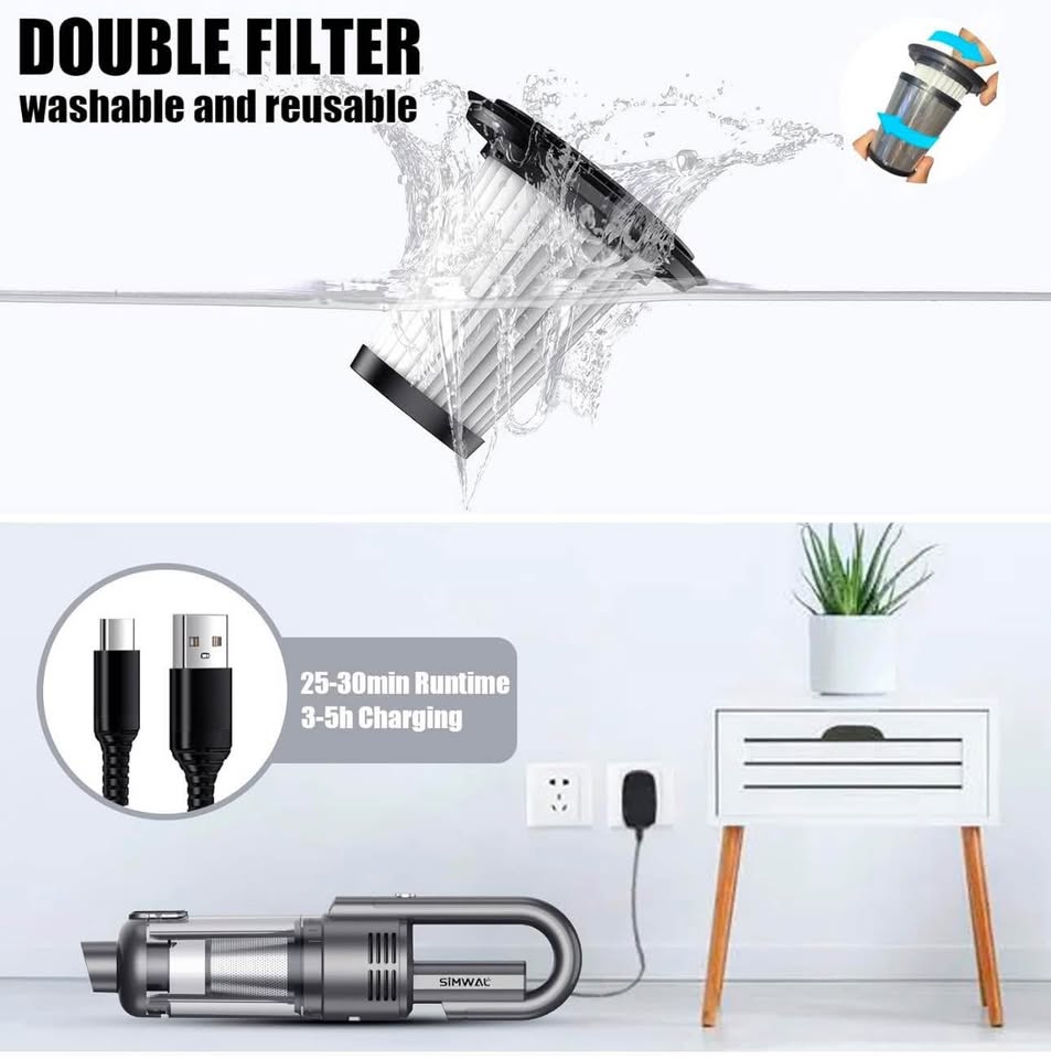 The new upgraded handheld vacuum cleaner is equipped with a brushless motor to optimize the power and suction, which is the perfect solution to your suction power concerns. It provides 120W/9500Pa powerful suction to pick up stubborn sand, dust and debris easily