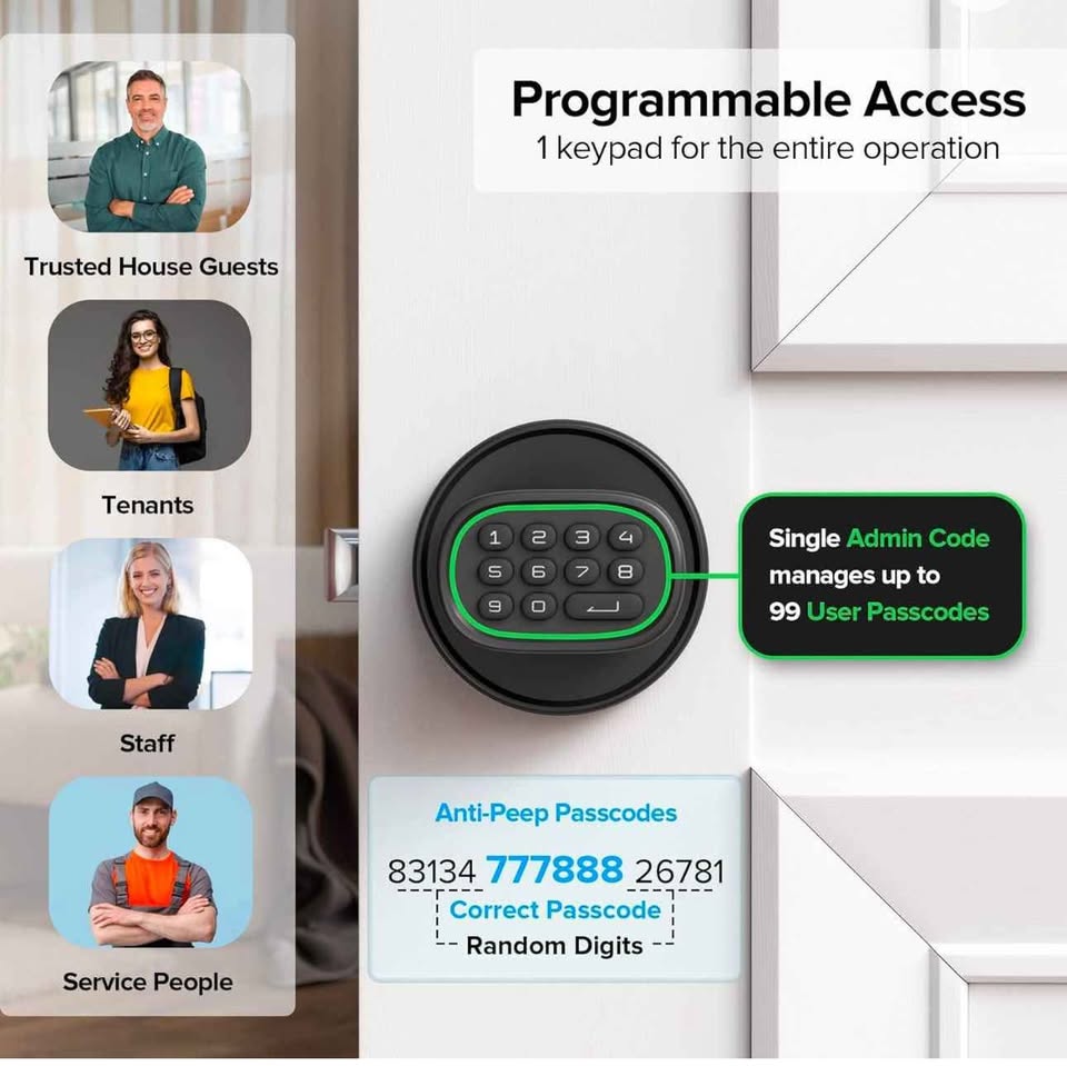 Easy Programming with Innovative Keypad. Manage up to 100 passcodes for access, alongside settings like Passage Mode and Silent Mode using a single admin code.