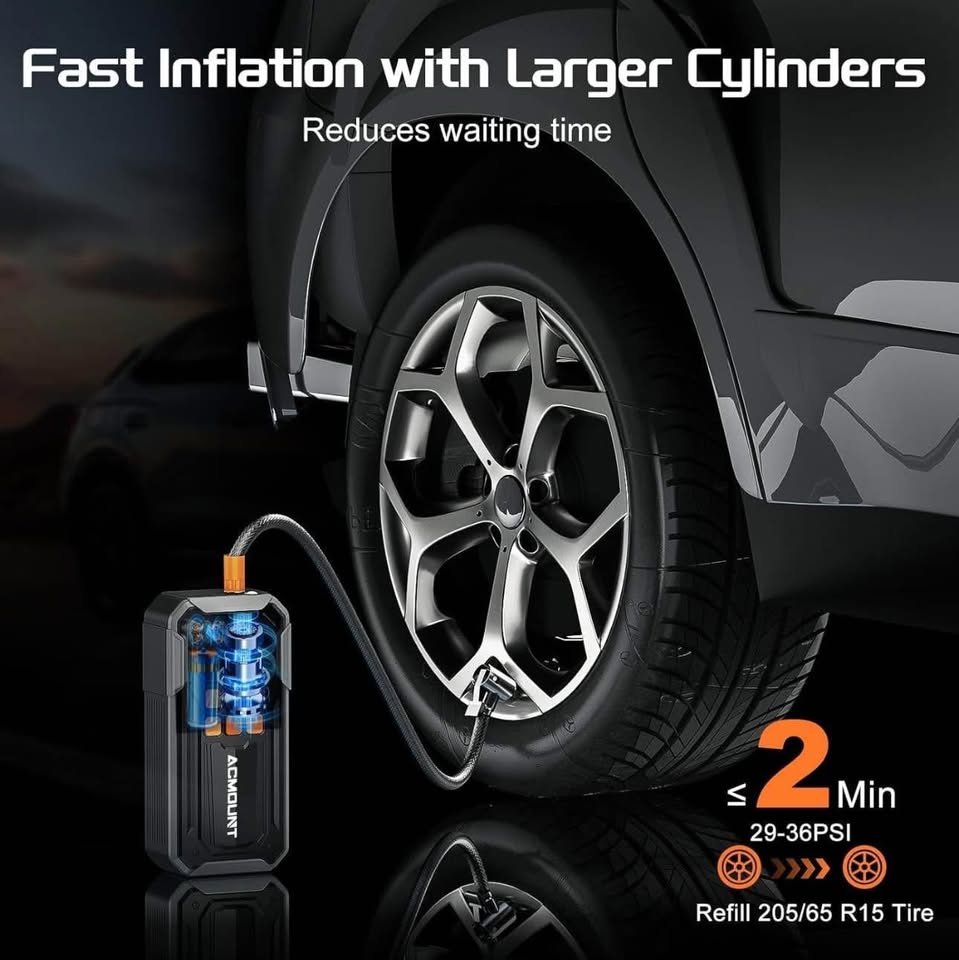 Built in high-performance chip and powerful motor, portable tire inflator provide 30L/Min airflow of 160PSI inflation, 3X faster than other tire inflators. Acmount air compressor can inflate small car tires (25-36 PSI) in 1 minute or completely flat car tires (0-36 PSI) in 5 minutes. Acmount tire inflator will be the perfect companion for your car, motorcycle and bicycle on road trips.